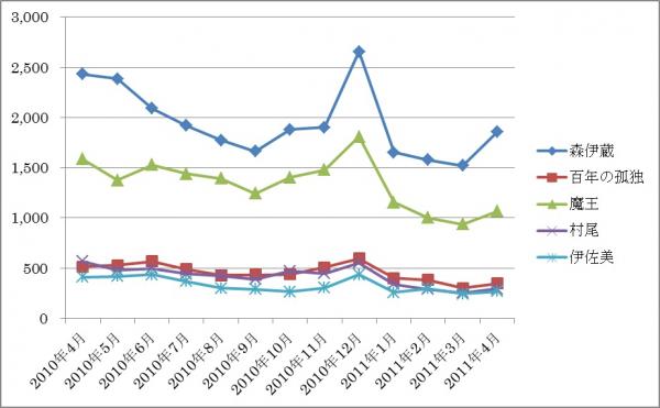 <プレミア焼酎5品 過去1年間落札数推移(グラフ)>