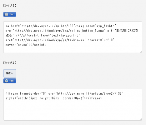 mypolicy のサイト上 「API / 政治家宛FAXボタン」( http://mypo.li/api ) より2ステップで作成/設置することができます。