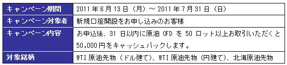 IGマーケッツ証券株式会社は、本日「原油5万円キャッシュバックキャンペーン」を開始いたしました。キャンペーン期間中に新規口座開設を頂き、一定のお取引量以上のお客様に対し、50,000円をキャッシュバックいたします。