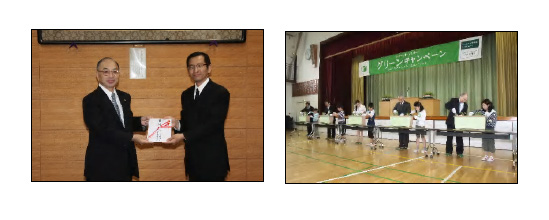 寄贈式では、国土緑化推進機構「緑の大使」が「緑化メッセージ」を披露したあと、出席者と児童代表で花苗を植樹した。
