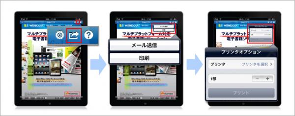 Wisebook2 for iOS は、iOSのバージョン4.2から搭載されたAirプリントに対応しました。デバイス上で開いているページをストリーミング書籍でも、ダウンロード書籍でもプリントアウトすることが可能です。