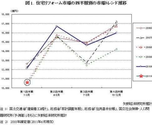 2011年第1四半期の住宅リフォーム市場規模は前年同期比約13.1%増の1兆517億円と推計する。昨年の同時期が、近年になく好調に推移したこともあるが、2000年以降で3番目に低いスタートとなった。要因としては、東日本大震災による消費低迷、建材・設備機器の搬入遅延がある。2011年1~2月はむしろ昨年同月より6.6%増加で推移していたものの、3月単月で前年同月比35.9%減となったことが、震災の影響を表している。