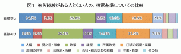 投票基準を被災経験で比較すると、人柄、見た目・印象を重視する割合は、被災経験がない若者では21.7%、被災経験がある若者では14.8%となりました。その一方で、所属政党、日頃の活動・実績を重視する割合は、被災経験がない若者では29.5%、被災経験がある若者では35.8%となりました。