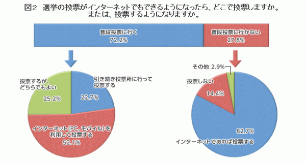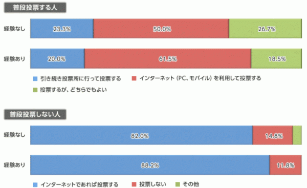 普段投票しない若者の82.7%がインターネットであれば投票すると回答しており、前回調査(2011年4月)の78.6%を上回る結果となりました。インターネット選挙を解禁すれば、若者層の投票率向上の公算が大きいことが示される結果となりました。