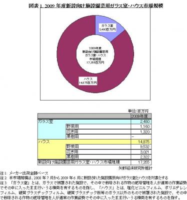 2009年度(2008年7月から2009年6月)において新設された施設園芸向けのガラス室とハウスの市場規模は、メーカー出荷金額ベースで173億5,500万円であった。施設園芸では、生産に多くの資材を必要とする。特に、被覆資材、暖房用の燃油、肥料などは多くを輸入に頼っており、グローバル経済の影響を大きく受ける。とくに、昨今の重油価格の高騰は施設園芸に大打撃を与えている。