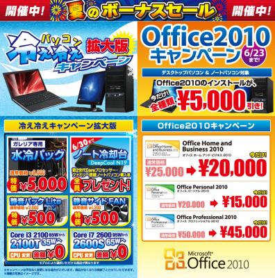 5月に開始して好評をいただいている「パソコン冷え冷えキャンペーン」に加え、ノートパソコンには冷却台を無料プレゼント、また全モデルにOffice2010の特価を追加いたしました。