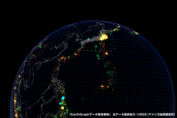 膨大な情報が溢れている現代社会において、EarthGraphは、理解や検証に時間のかかる膨大・複雑なデータを目に見える形に3DCGで再構築し、地球全体規模でデータを一度に表示することを可能にするシステムです。当システムはあらゆるデジタルデータに対応し、その利用法はデータの種類により更に可能性が広がります。
