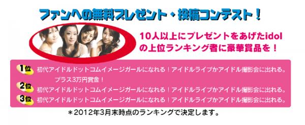 アイドルオーディション・ファンへ無料プレゼント、アイドルモデル撮影会投稿人気ランキングコンテスト!1位~3位は初代イメージガール2012、アイドルライブ、アイドル撮影会に出演できる!賞金3万円が当たる!