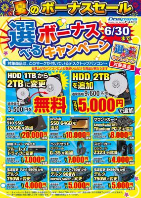 全国24店舗及びウェブ通販のパソコンショップ『ドスパラ』を運営する株式会社サードウェーブ(代表取締役 : 尾崎健介、本社 : 東京都千代田区)は、2011年6月22日より、デスクトップ型PrimePCをご購入時に、1TBのハードディスクを無料で2TBへアップグレードなど、お得なカスタマイズがひとつ選択いただける「選べる夏のボーナスキャンペーン」を開始いたしました。