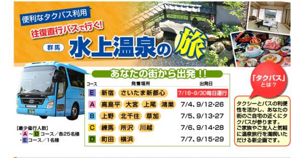 「タクバス」とは、タクシーとバスの利便性を活かしたアイデアで、あなたの街のご自宅近く(=首都圏14カ所の駅前=添付PDF参照)と温泉リゾート地を往復直行バスで結ぶことにより、ご家族やご友人と気軽に、かつリーズナブルに温泉旅行を満喫いただけるという新企画。また、このタクバス企画は各施設の活性化はもちろんですが、加えて同リゾート地全体の活性化にもつながるというものです。