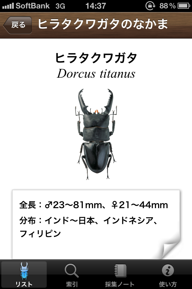 世界中で見られるカブトムシ/クワガタムシを収録した電子図鑑アプリケーションです。