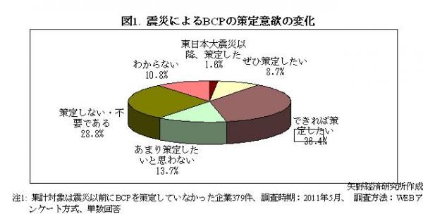 震災以前にBCPを策定していなかった企業に策定意欲が変化したかを聞くと、46.7%が、東日本大震災を契機に意欲を持つようになったと回答した。BCPの策定は多くの企業で重要課題として認識されるようになっており、取組みが加速する見通しである。