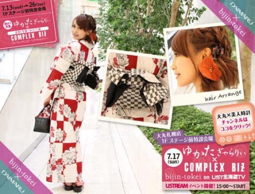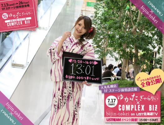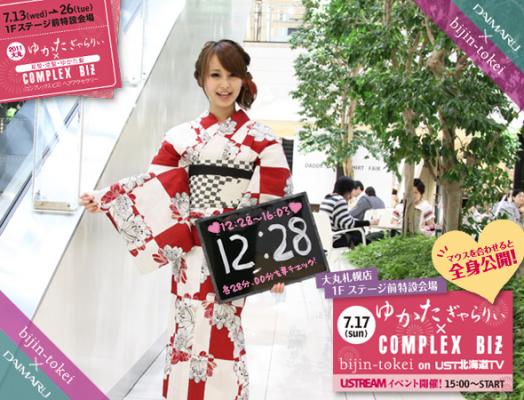 大丸札幌店1階特設会場にて7月13日から26日迄の間、実施される「ゆかたギャラリー×コンプレックスビズ(ヘアアクセサリー)」イベントのPRとして、美人時計北海道にて人気の8名のモデルが浴衣姿で登場。マウスオーバーでは、彼女たちの全身浴衣姿が見れる共にヘアアクセサリーと、着用の帯をご紹介していきます。また、7月17日には、同会場にて「ゆかたギャラリー×コンプレックスビズ」ユーストリーム生中継イベントを開催。MCとして6人の美人時計モデルたちが出演し、おすすめの浴衣やヘアアクセサリーをご紹介していく予定です。ユーストリーム生中継中、ツイッターで、コメントの後にハッシュタグ「(半角スペース)#dsyukata2011」をつけてご参加下さい!