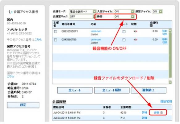 1会議あたり、最大6時間まで録音することができ、録音の制御はWeb管理画面(カンファレンスマネジャー)から、自由に制御することができます。