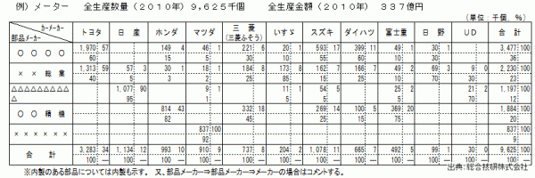総合技研株式会社の「2011年版 主要自動車部品255品目の国内における納入マトリックスの現状分析」は日本国内における主要自動車部品255品目の部品メーカー⇒カーメーカーへの納入先、納入量についてのデータを掲載しています。