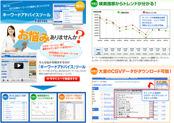 ■FerretPLUSとは、WEBサイトの運営、ECサイトの運営、アフィリエイトやドロップシッピングに役立つSEO対策やSEM対策のツールを提供しているサービスで、これらのツールは無料の「ユーザ登録」をすることでご利用になります。