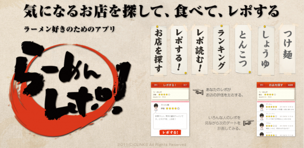 CLINKS(クリンクス)株式会社(本社:東京都中央区 代表取締役:河原浩介)は、既にAndroidアプリとしてリリースされているラーメン情報コミュニティアプリ【 らーめんレポ! 】のiPhoneアプリをGREE Platformでリリースした。アプリのダウンロードはApp Storeで行うことが出来る。