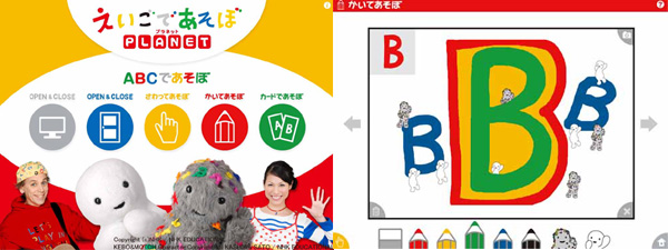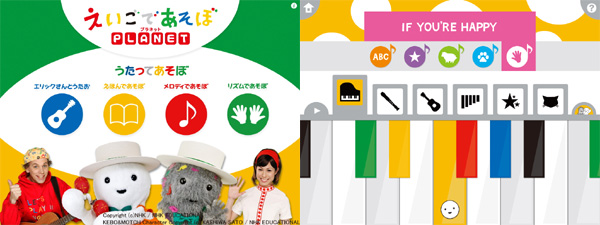 iPadアプリ「えいごであそぼプラネット」シリーズは、NHK 教育テレビの人気番組『えいごであそぼ』から生まれた幼児用英語セット教材『えいごであそぼプラネット』(発行・販売:旺文社)の一部を抜粋、改変、追加したものです。