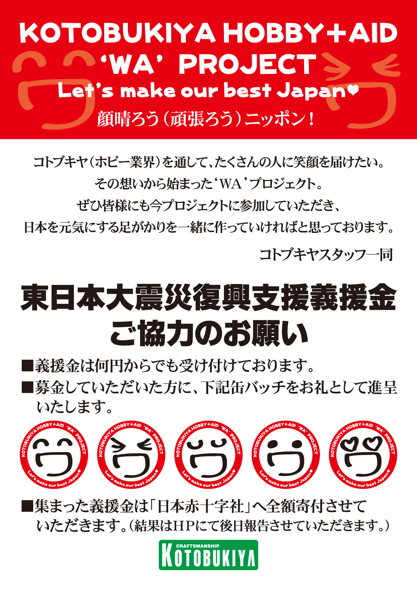 また、当日は来場者のお客様に義援金をお願いする予定となっております。義援金を頂いた方には、弊社よりお礼として「わ」バッジ(5種類)を進呈させて頂きます。