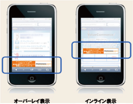 スマートフォン広告は、Webコンテンツ上に重なるように表示されるオーバーレイ表示、Webコンテンツ内に表示されるインライン表示の2種類の表示方法から選択可能です。