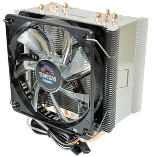 ETS-T40-VDは、IntelとAMDの最新ソケットに対応したサイドフロータイプのCPUクーラーです。特許を取得したVGFテクノロジとSEFデザインに加え、フラップ形状を施した独自のフィンとダイレクトタッチ式ヒートパイプにより、世界トップクラスの熱抵抗性能0.09/Wを実現しています。ファンには、PWM機能とブルーとレッドのLEDを搭載したT.B.VEGAS DUOタイプの120mmファンを採用しています。