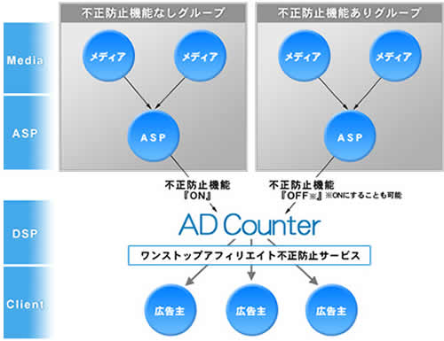 ⇒AD Counterのワンストップ不正防止機能を利用、またはASP/媒体社様各社の不正防止機能を利用