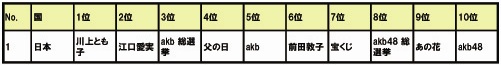 日本では、話題の人物・イベント・アニメ及び季節性の高いキーワード(父の日・宝くじ など)が急上昇しており、特にAKB48関連のキーワードが上位を占めています。また、アニメ関連キーワード(“あの花”など)は、小説化・DVD化・映画化などにより急上昇する傾向にあります。