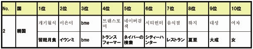 韓国では、人気・話題の映画やドラマのキーワードが急上昇しています。また、皆既月食や大成(人気アイドルグループBIGBANGのメンバーの一人。6月に交通事故を起こした。) など、時事ニュースや企業ニュースに関連するキーワードが急上昇しているのも特徴です。一方で、レストランなどの一般的なキーワードも含まれています。