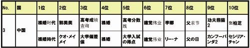 中国では、社会的な話題やニュースの他にも、流行のテレビ番組や話題の人物のキーワードが急上昇しています。大学入試の最高得点者の公表を控えるように、教育省が発表したことが話題になり、大学入試関連キーワードが上昇しています。