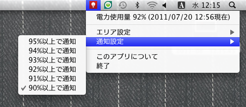 当アプリケーションは、東京電力、東北電力、中部電力、関西電力、九州電力の5電力会社に対応しており、ユーザーは、表示・通知する電力会社を選択出来るほか、何パーセントで通知を行うかを設定することもできます。