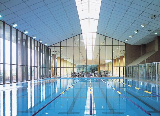 下は、緑に包まれた屋外トラックと、センター内にある室内プール(下)。