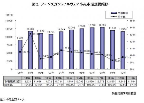 カジュアルウェア市場の内数であり、ジーンズカジュアル専門・専用売り場で販売されている洋品(ウェア)を対象とし、小売金額ベースにて市場規模を算出した。ただし、「子供・ベビー洋品」及び「肌着類」は除く。