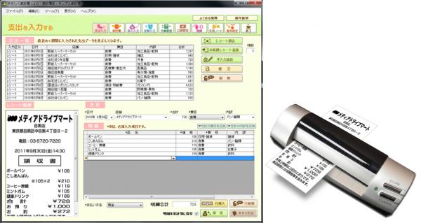 「やさしく家計簿 v.2.0」は、レシートを付属の専用スキャナや複合機などから読み込み、記載されている品名や金額などを文字認識(OCR)することで家計簿が作成できるソフトウェアです。OCR結果は購入した店舗名・品名・価格・合計金額などの支出明細に自動で振り分けることができますので、キーボードから入力する手間が省け、簡単に家計簿を作成できます。