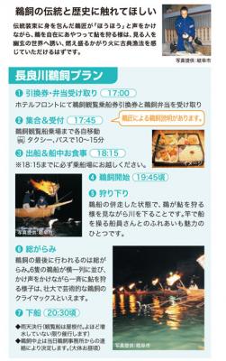 同「鵜飼プラン」の概要は、添付ファイルのとおりですが、伝統装束に身を包んだ鵜匠が「ほうほう」と声をかけながら、鵜を自在にあやつって鮎を狩る様は、見る人を幽玄の世界へ誘い、燃え盛るかがり火のむこうに古典漁法を彷彿させるひとときが訪れます。長良川鵜飼見物のピークは7~8月の夏休み期間となりますが、見物客の混雑を避けた9月~10月の観覧もまたおすすめ。ゆとりをもっての観覧がじっくり堪能できます。
