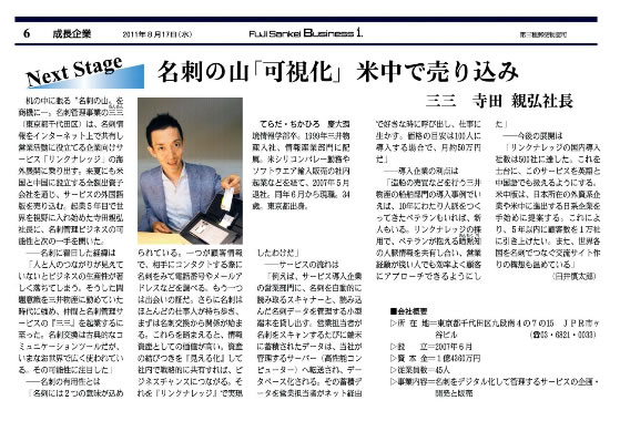 フジサンケイビジネスアイ(2011年8月17日号)6面・成長企業欄【Next Stage】特集に代表の寺田が登場。サービスの可能性とグローバル展開について語り、“名刺の山「可視化」 米中で売り込み”と題して起業5年目で世界を視野に入れ始めた成長企業として紹介されています。
