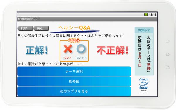 体の健康度合いを簡単にチェックするアプリ(「カラダ部位別チェック※3」「簡易健康チェック※4」)、健康情報を配信する読み物アプリ(「ヘルシーQ&A※5」「ヘルシートリビア※6」)
