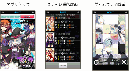 『マジカ★パズル~グリモワール編~』は、現在「GREE Platform for FeaturePhone」にて展開中の萌え系恋愛ゲーム『マジカ★マジカ(http://pc.mj-mj.jp)』に登場する美少女キャラクターの画像(イラストレーター:zinno・ささきむつみ他)を使い、バラバラになった絵のピースを指でスライドさせて元の絵を完成させるパズルゲームアプリです。
