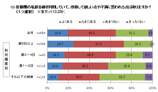 ●私鉄利用者(684人)のうち、改善して欲しい・不満に思う点が「よくある」「たまにある」と回答した人は65.1%。
