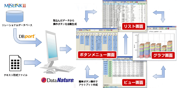 「MJSLINKII販売大将」のリレーショナル・データベースから、直接、データ活用に必要な最新データを抽出して(*)、「DataNature」へ自動的に展開することで、見たいデータを自由に検索・分析、定型のアウトプット(集計表・グラフなど)の確認をする事ができます。