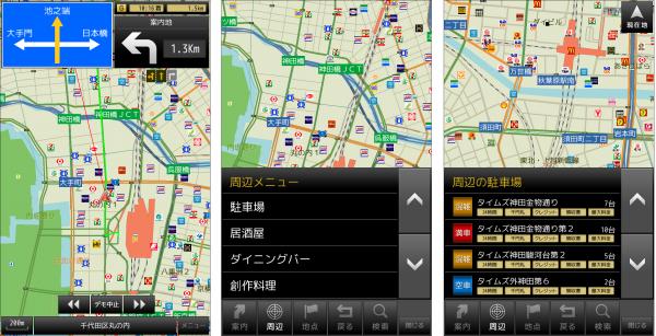 基本的なナビゲーションだけではなく、通信を使用した、周辺駐車場検索、飲食店検索機能などの通信型ナビゲーションの機能も、ふんだんに盛り込んでいます。