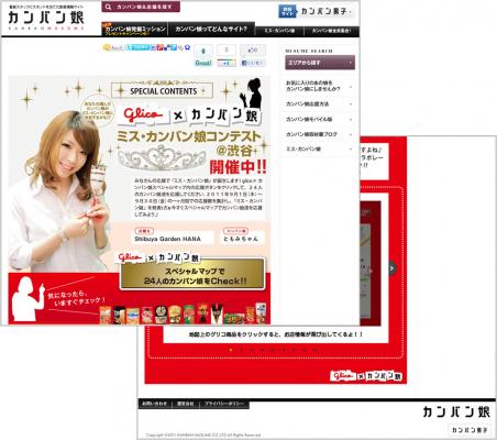 『glico×カンバン娘 ミス・カンバン娘コンテスト@渋谷』では、本キャンペーンの特設ページ内に設置しているFlashコンテンツ、glico×カンバン娘スペシャルマップ内に応援機能を追加。2011年9月1日(木)~2011年9月30日(金)のコンテスト開催期間の応援数を集計し、最も応援されたカンバン娘『ミス・カンバン娘』を選出致します。