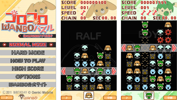 『コロコロWANBOパズル』は、次々と落ちてくる「WANBO」(ワンボ)のキャラクターでデザインされたブロックを左右にスライドして、同じブロックを3つ以上縦か横に揃えて消していく落ち物パズルです。