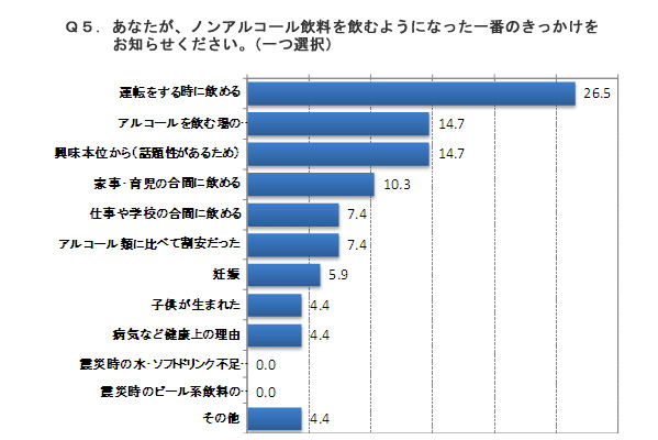 ノンアルコール飲料を飲むようになった一番のきっかけを尋ねたところ、「運転をする時に飲める」が最も多く26.5%。
