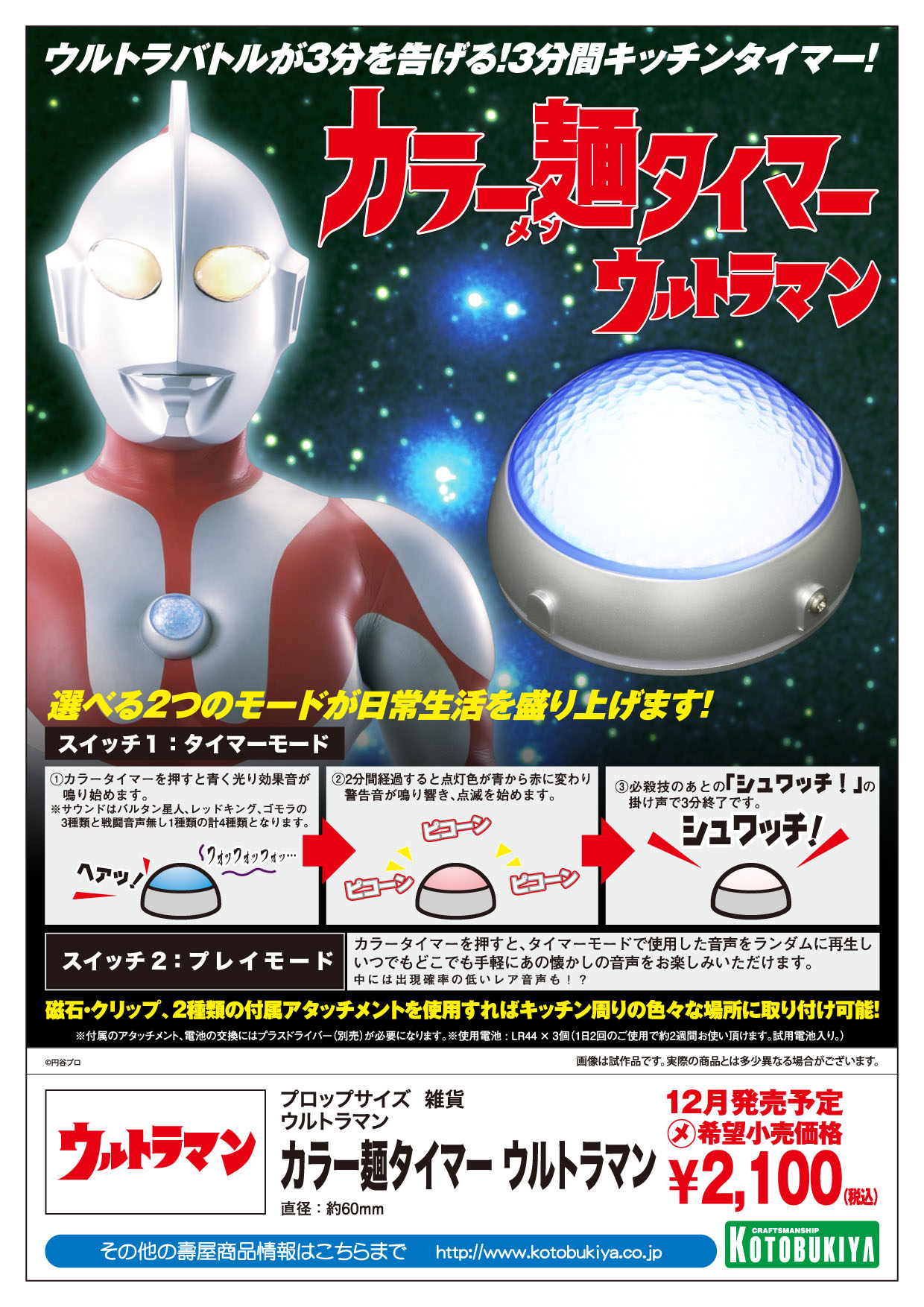 ウルトラマンの胸に灯るカラータイマーの形をした面白キッチンタイマーです。サイズは本物のカラータイマーから採寸した実物大青い点灯から赤い点滅に変化するお馴染みのライトギミックと、ウルトラマンとバルタン星人、ゴモラ、レッドキングという人気怪獣との戦いをイメージした臨場感あふれる音声ギミックで退屈な調理待ち時間が楽しい時間へと早変わり!