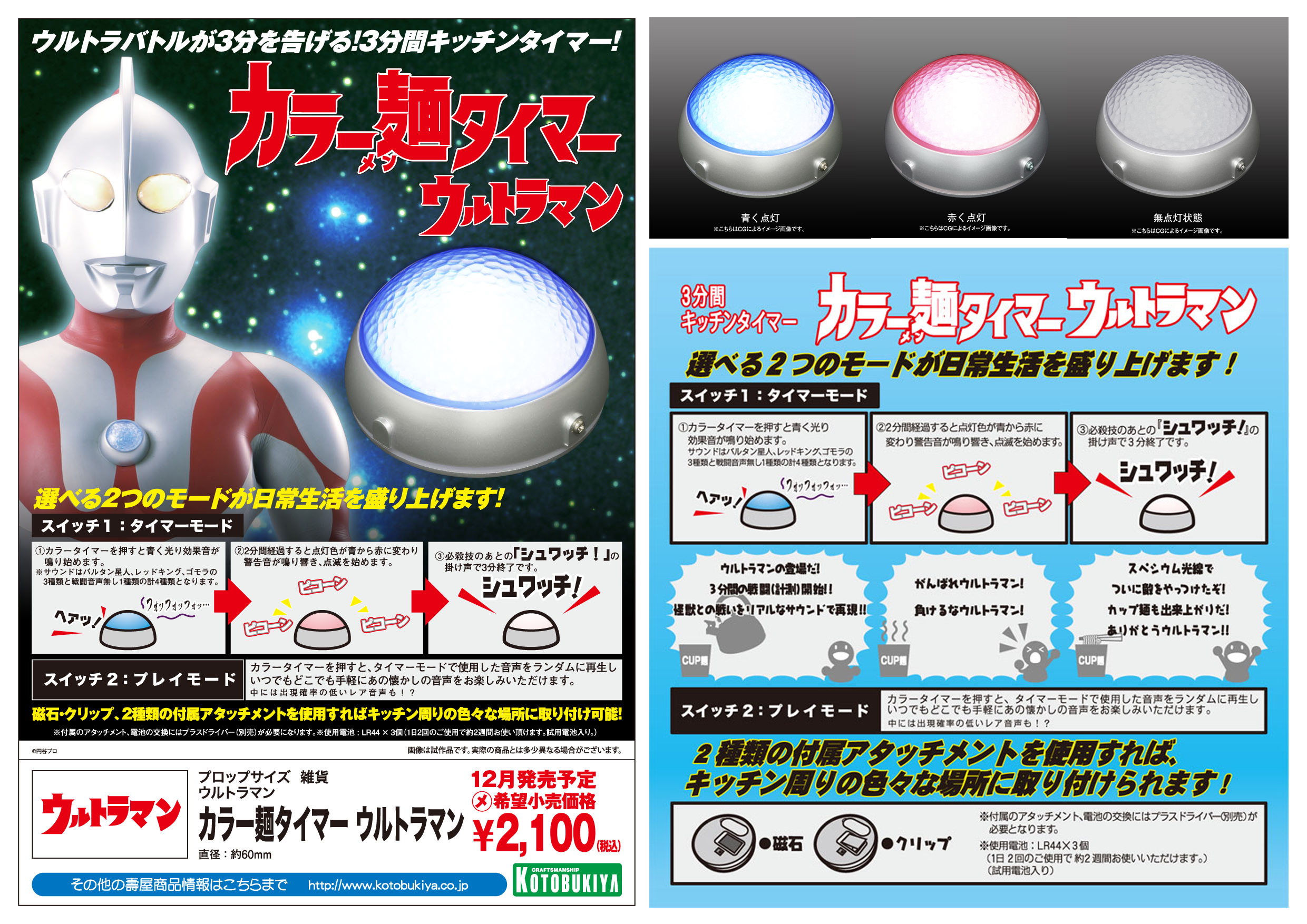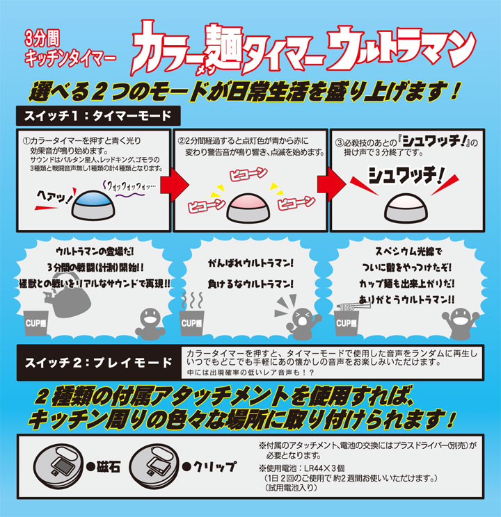 計測時間はウルトラマンの活動時間である3分(固定)ですので、ポンと押すだけでお手軽に標準的なカップ麺の調理時間等を計ることが出来ます。付属のマグネットまたはクリップのアタッチメントパーツを装着すれば、冷蔵庫などのスチール面や衣服の胸元などにも取り付けることが可能です。