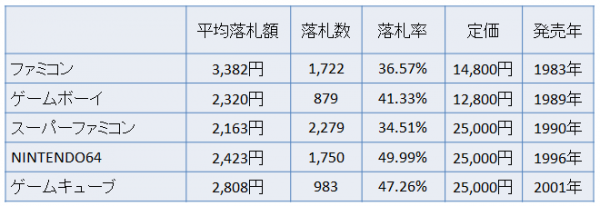 ネットオークションにおける「懐かしの任天堂家庭用ゲーム機」の落札動向比較をいたしました。