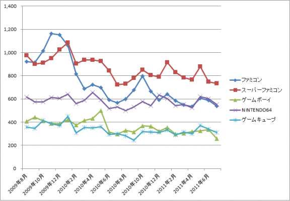 ファミコンは落札数が下降気味であることがわかりました。