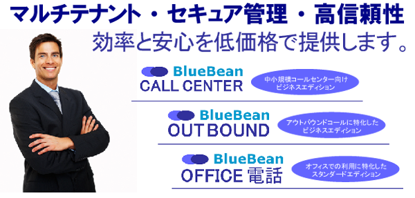 BlueBeanは「マルチテナント」「セキュア管理」「高信頼性」を基本コンセプトに設計開発、総合コールセンター向け”BlueBean CALL CENTER“、アウトバウンドコールセンター業務に特化した”BlueBean OUT BOUND”、オフィスでの利用に特化した”BlueBean OFFICE電話”の3つエディションで構成されているAsteriskベースのCTIシステムです。クラウド化することで低価格化を実現しており、中小企業のコールセンター業務、電話業務に機能面や価格面でジャストフィットします。