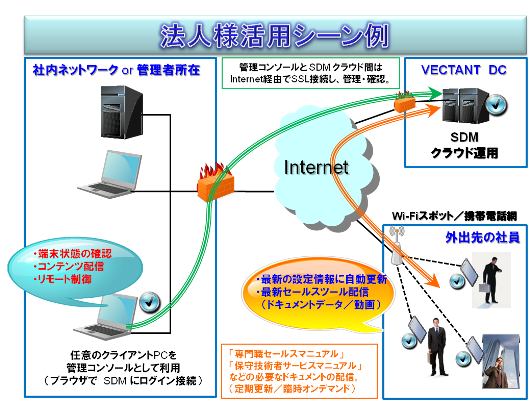 今回、サービス提供を発表する「VECTANT-SDM」は、企業による大量導入が本格化しているAndroid搭載のスマートフォンやタブレット端末の設定管理および有効活用のために必要な機能をクラウド型サービスとしてご利用いただけるものです。スマートフォンやタブレット端末を管理するためのシステムは一般的に「MDM(Mobile Device Management system)」と呼ばれており、企業においてスマートフォンやタブレット端末の導入・設定・管理・セキュリティ確保・ビジネスシーンでの有効活用のために必須なシステムとなってきたことから、自社構築型に比べて導入が容易なクラウド型サービスとして提供を開始致します。