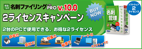 「やさしく名刺ファイリング PRO v.10.0 2ライセンスキャンペーン」では、「会社と自宅」「社長と秘書」「デスクトップとノート」など2台のPCでご利用いただける2ライセンス商品を、通常2本買うよりお得にお買い求めいただけます。
